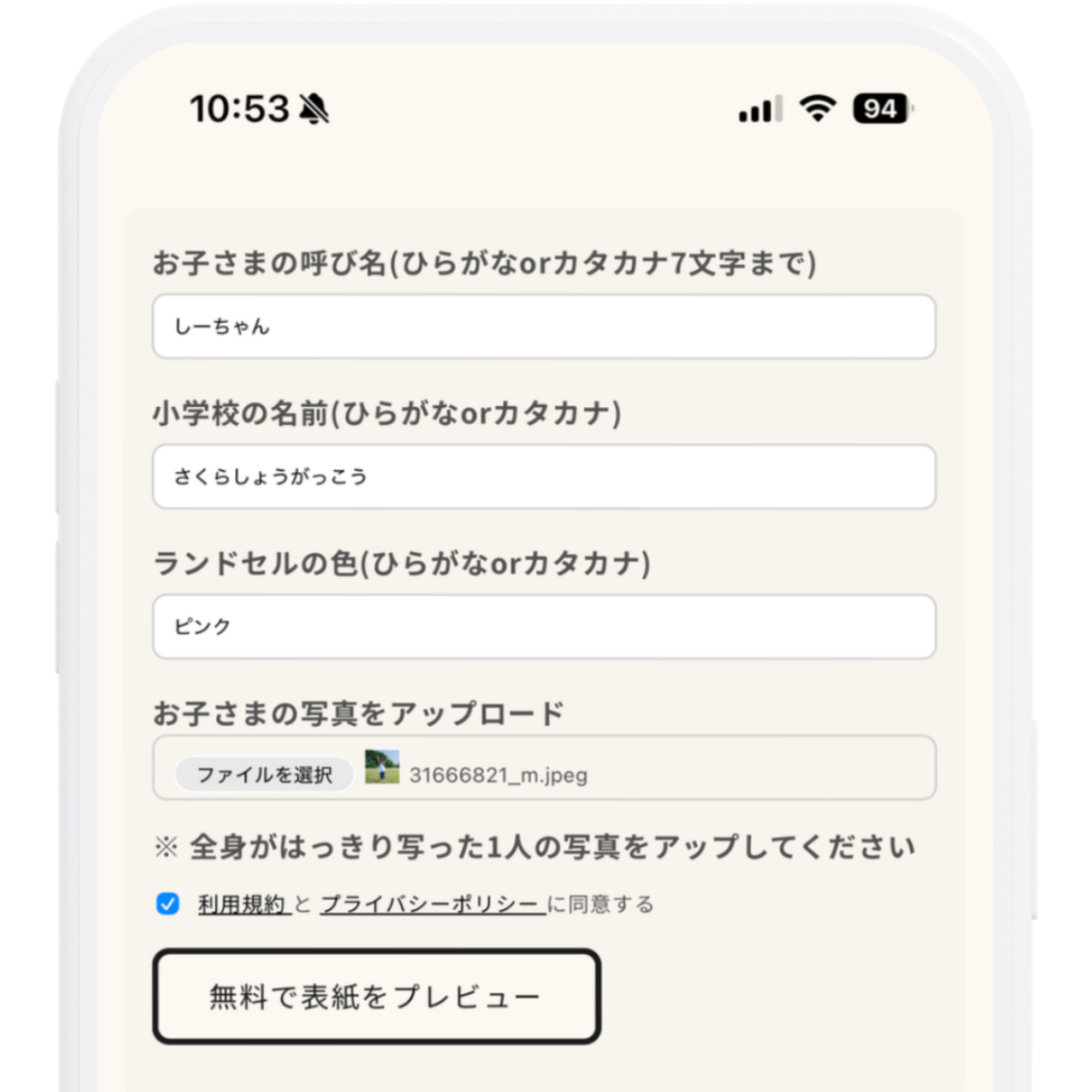 スマホでお子さまのお名前や写真1枚をアップロード